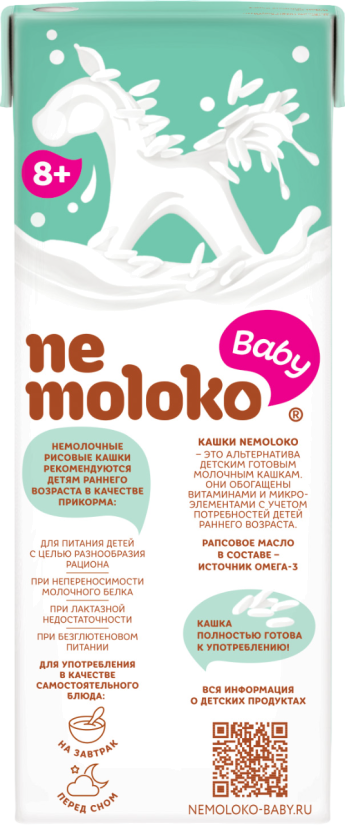 - В безмолочной рисовой кашке Nemoloko нет молочного белка и лактозы.