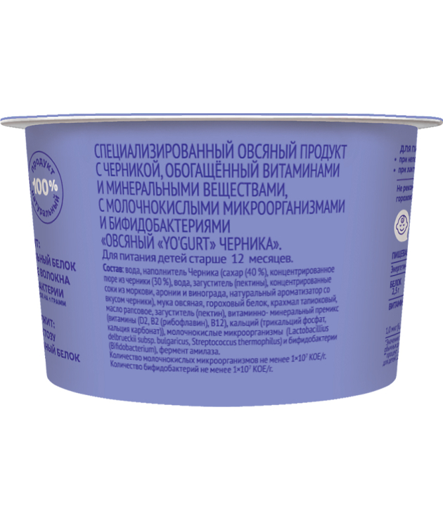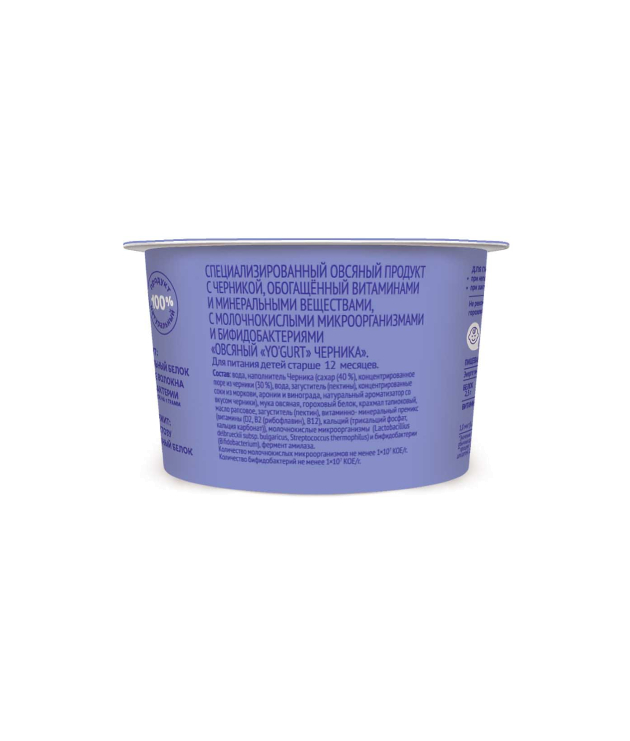 вода, наполнитель Черника (сахар (40 %), концентрированное пюре из черники (30 %), вода, загуститель (пектины), концентрированные соки из моркови, аронии и винограда, натуральный ароматизатор со вкусом черники), мука овсяная, гороховый белок, крахмал тапиоковый, масло рапсовое, загуститель (пектин), витаминно-минеральный премикс (витамины (D2, В2 (рибофлавин), В12), кальций (трикальций фосфат, кальция карбонат)), молочнокислые микроорганизмы (Lactobacillius delbrueckii subsp. bulgaricus, Streptococcus thermophilus) и бифидобактерии (Bifidobacterium), фермент амилаза.