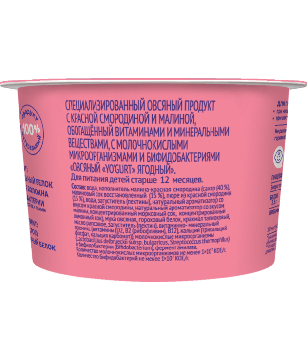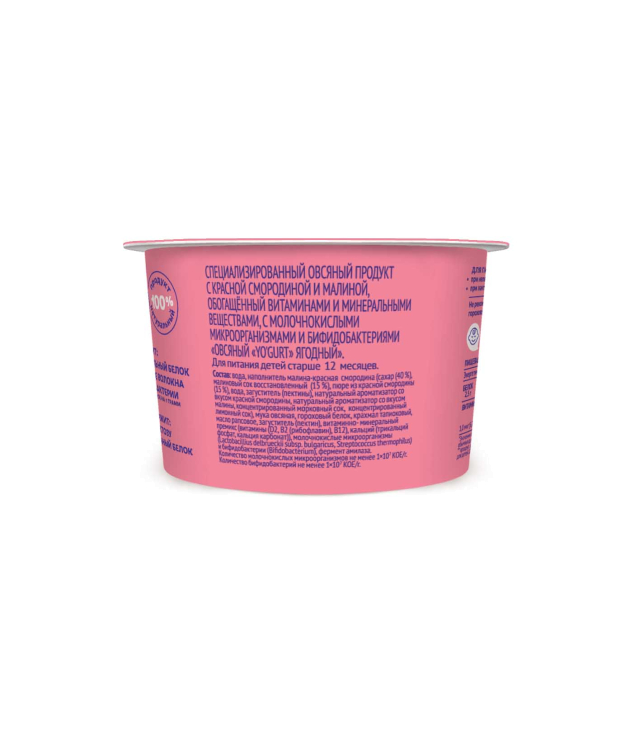 вода, наполнитель малина-красная смородина (сахар (40 %), малиновый сок восстановленный (15 %), пюре из красной смородины (15 %), вода, загуститель (пектины), натуральный ароматизатор со вкусом красной смородины, натуральный ароматизатор со вкусом малины, концентрированный морковный сок, концентрированный лимонный сок), мука овсяная, гороховый белок, крахмал тапиоковый, масло рапсовое, загуститель (пектин), витаминно-минеральный премикс (витамины (D2, В2 (рибофлавин), В12), кальций (трикальций фосфат, кальция карбонат)), молочнокислые микроорганизмы (Lactobacillius delbrueckii subsp. bulgaricus, Streptococcus thermophilus) и бифидобактерии (Bifidobacterium), фермент амилаза.