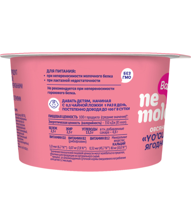 Детские йогурты Nemoloko обогащены протеином (гороховым). Комбинация нативного овсяного белка и дополнительно вносимого горохового протеина имеют достаточную биологическую ценность для ребёнка. В каждой порции содержится 2,25 г белка.